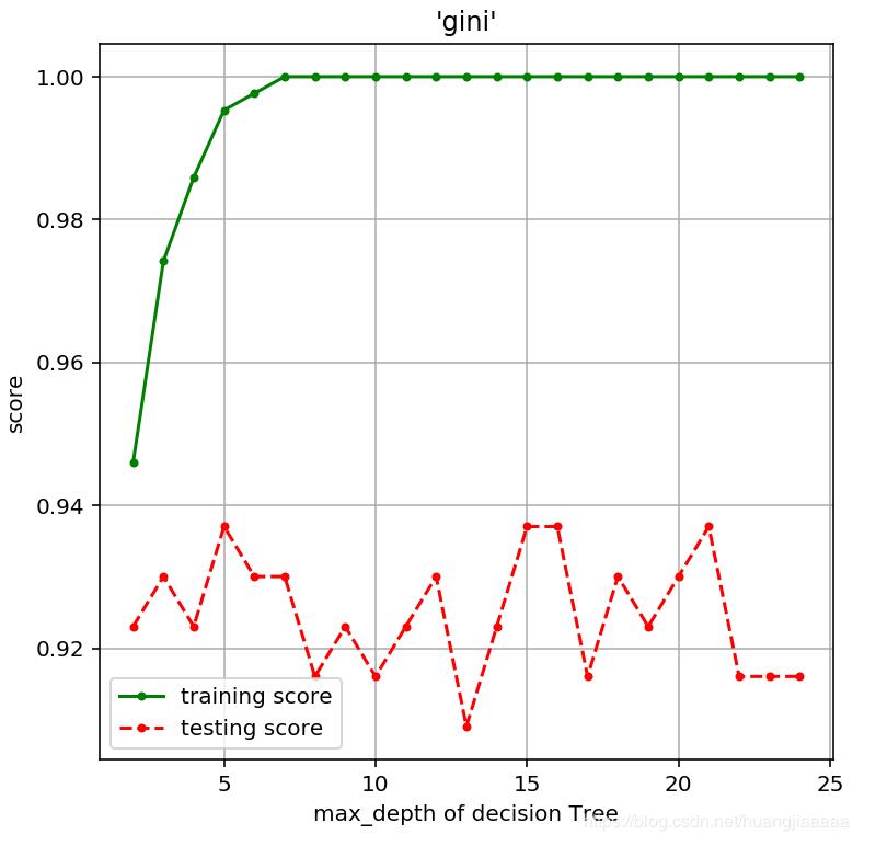 # 参数选择 max_depth,算法选择基尼不纯度算法(gini) or 信息熵(entropy)