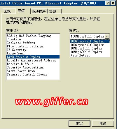 问题出在自己的服务器上,先不说提交的那份测试报告,自己是多么的无知,现在考虑的是该怎么解决速度问题?难道两个网卡都坏掉了?在无奈的情况下,就开始在系统中点这点那。突然发现一个地方非常值得一试。那就是网卡的连接速度。我们现在的网卡都是10M/100M自适应网卡。一般不会去人为调整网卡的连接速度。但是在这种无奈的情况下,只能一一测试。选择了100M的全双工模式。重新启动服务器以后,再测试速度,下载局域网文件已经回复正常,在其他地方点播视频也明显感觉速度提高了不少。
